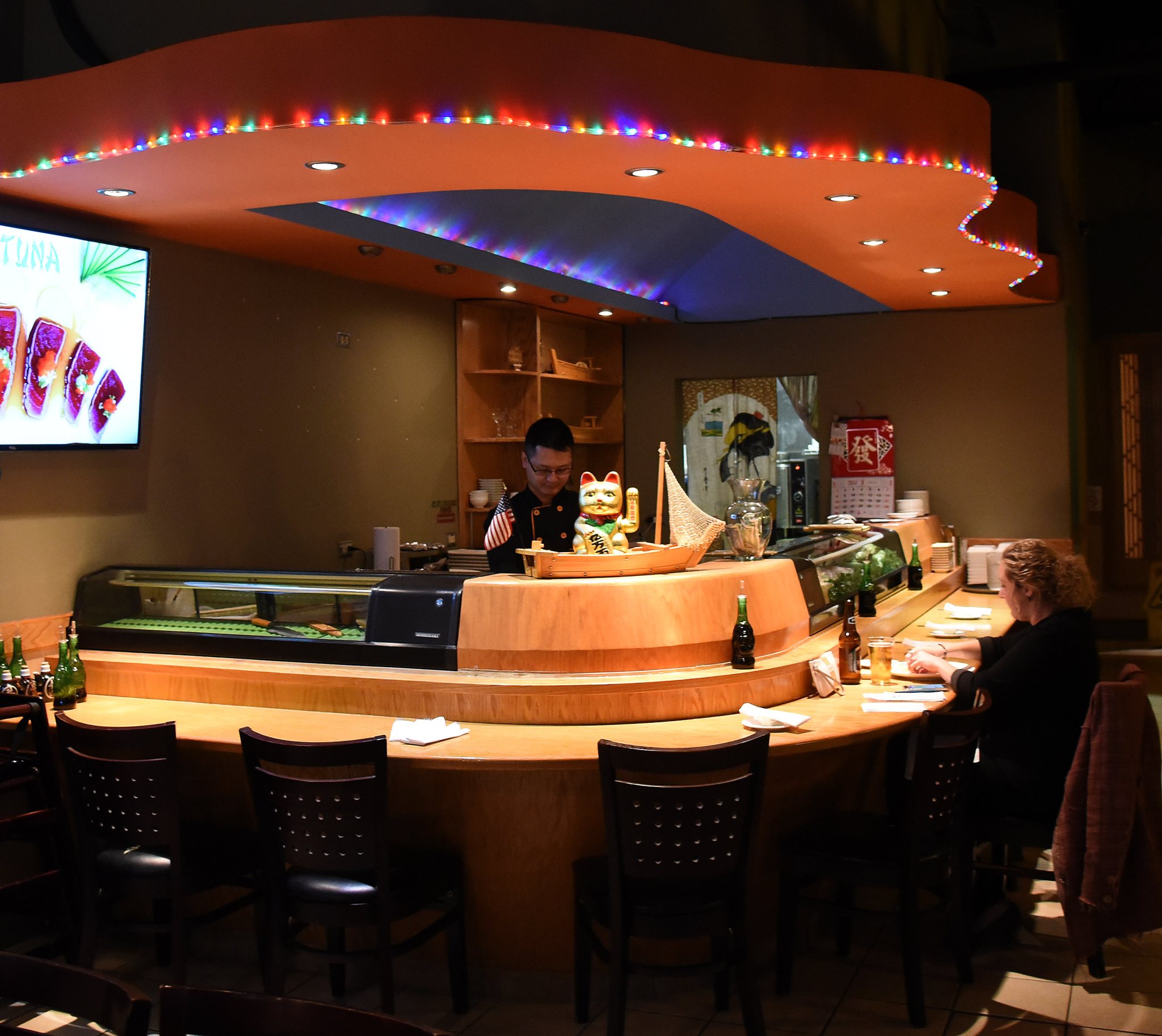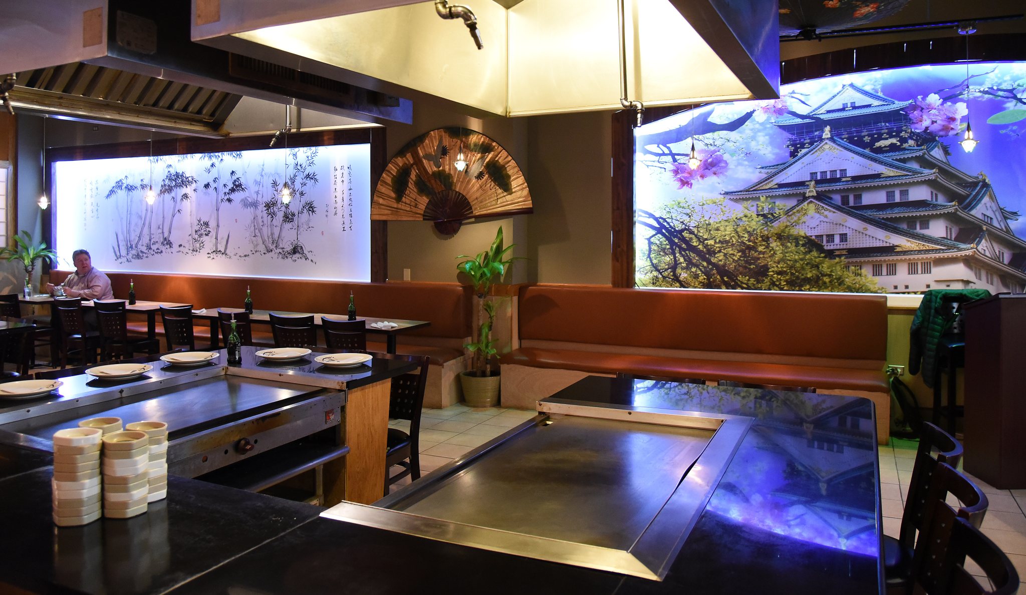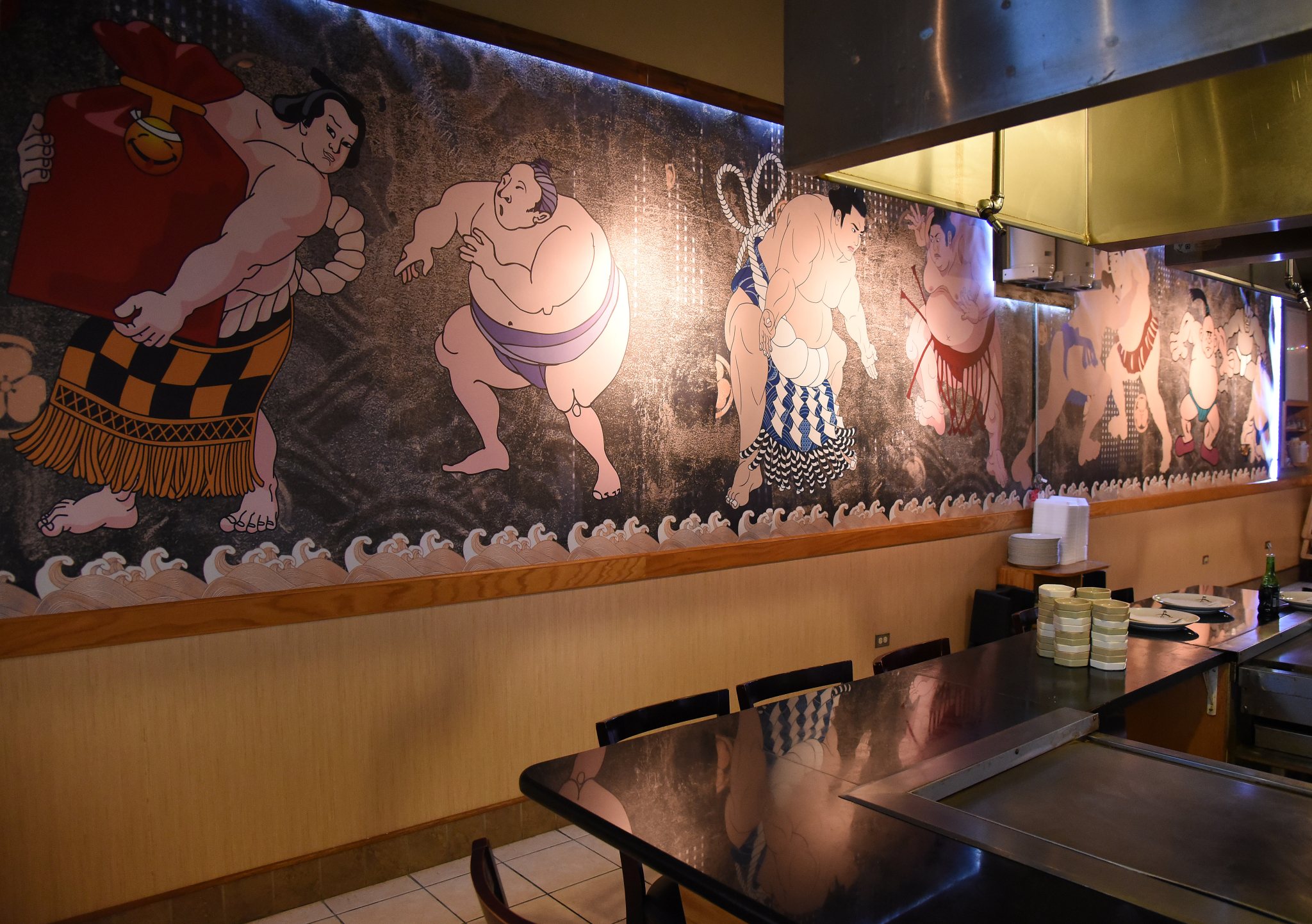 There are three distinct areas of the restaurant: a brightly lit bar, which, on the night we visited, alternately hosted singles and couples there just for the sips; four lively hibachi grills, a favorite of families with kids for the spectacle; and a sushi bar with 12 seats and four adjacent booths each seating up to six. Get a group together and reserve the tatami room, a traditional Japanese tea room with cushions and recessed seating.