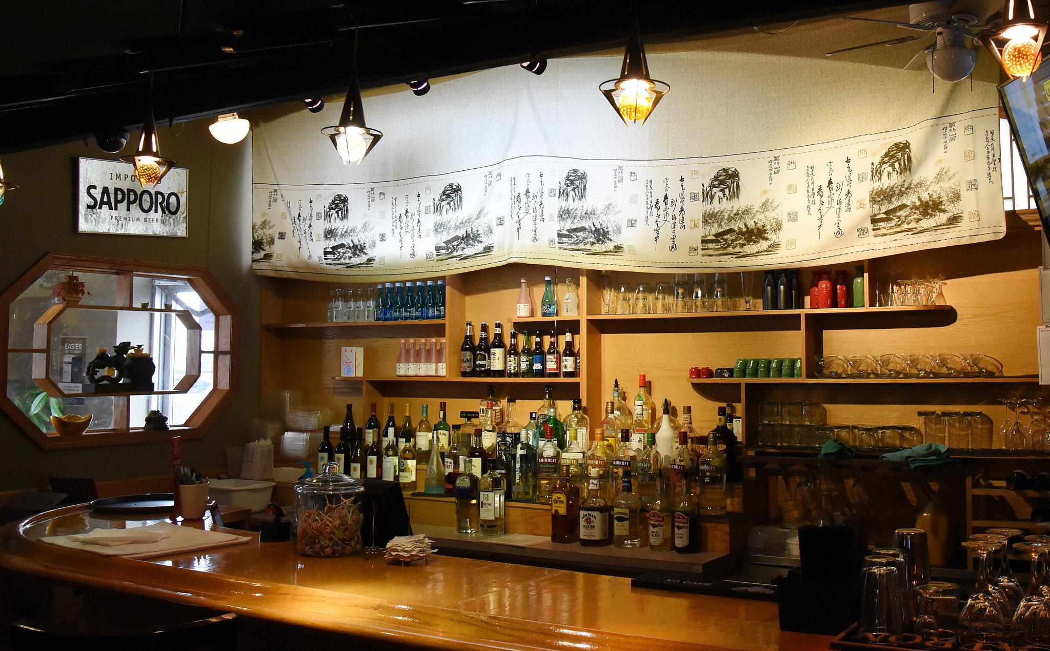 Signature drinks are on the sweeter side. The bartender shakes a lot of Mai Tais and something called a Bamboo Forest (coconut rum, silver rum, Midori, pineapple and orange juice). Martinis and signature drinks are $8, but there’s also Japanese beer, plum wine, a variety of other grapes, three cold sakes and hot sake on draft. Be sure to treat a kid to a Ramune, a fun Japanese soda with a glass ball in the bottle.